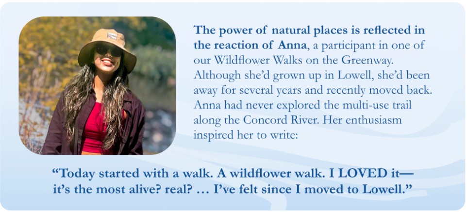The timing couldn’t be better. Now more than ever, people need places like Wamesit Falls on the Concord River Greenway—where the sound of rushing water invites us to slow down, breathe deeply, and rediscover our connection to the natural world close to home.