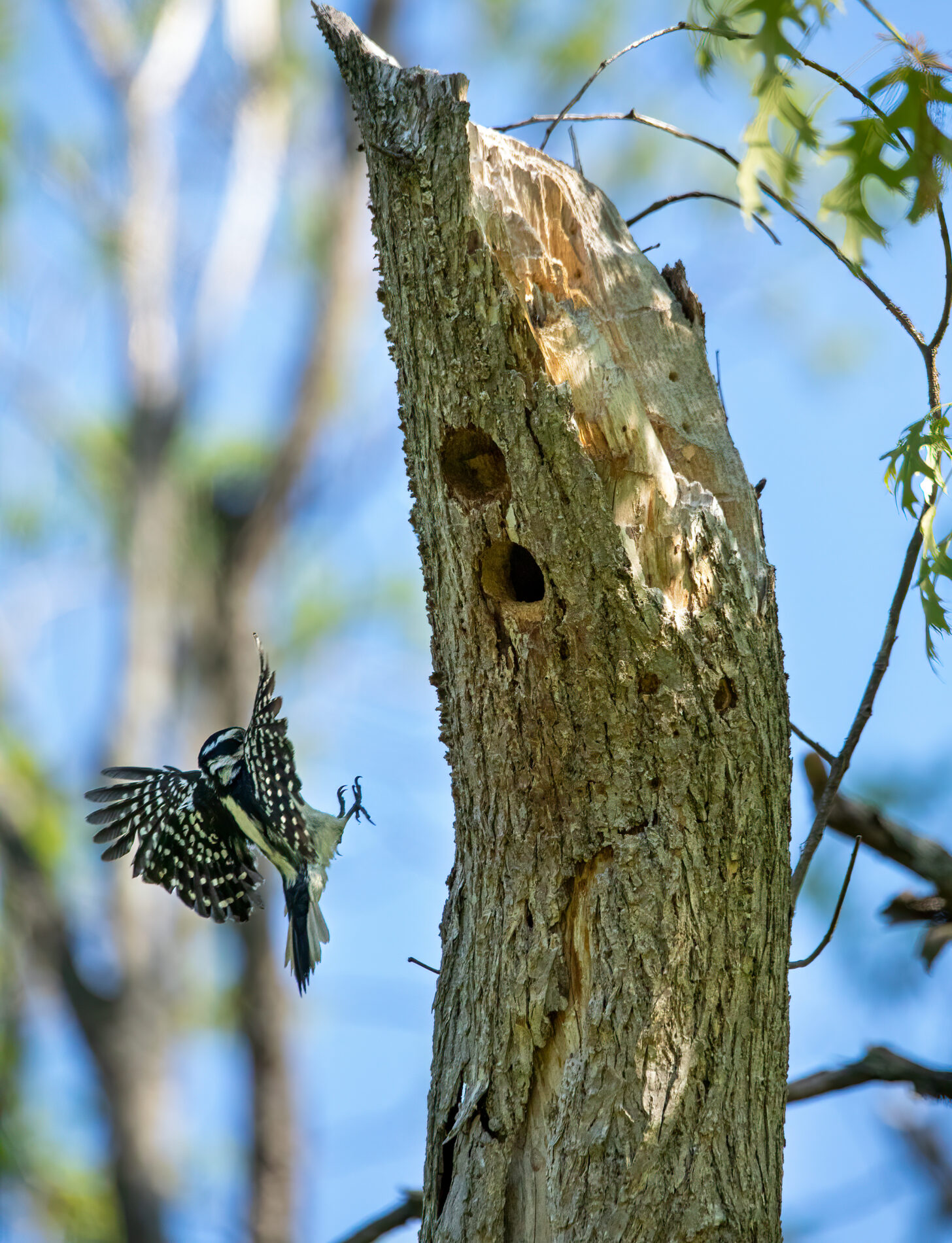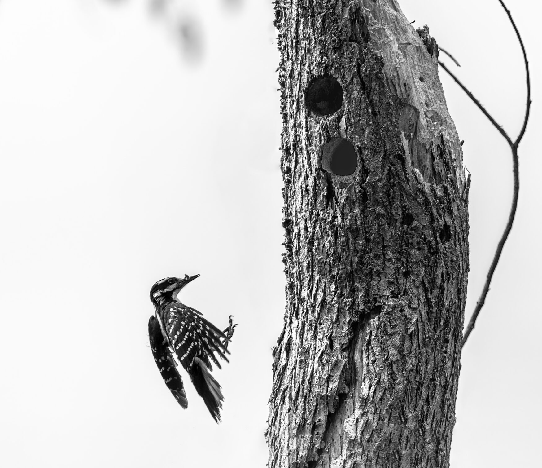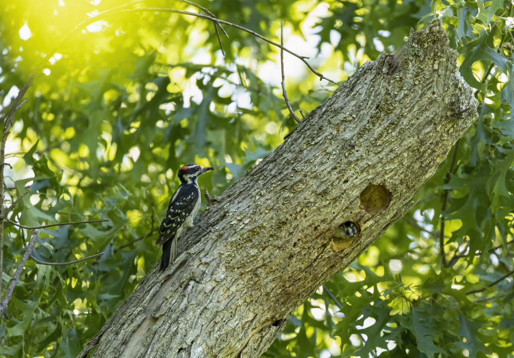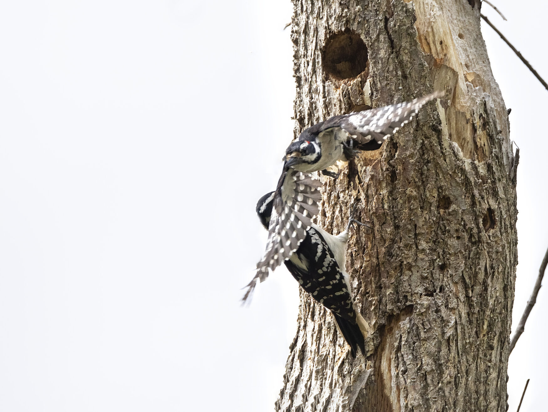 Hairy woodpeckers rely on dead snags for habitat, where they nest and forage by creating holes. To create the cavities, these birds use their bills to strike a tree at about 20 pecks per second! With air pockets that act like shock absorbers around their skulls, they are able to do this without injuring themselves.