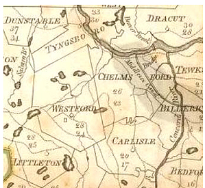 confluence with the Concord near the dam, north and west to the